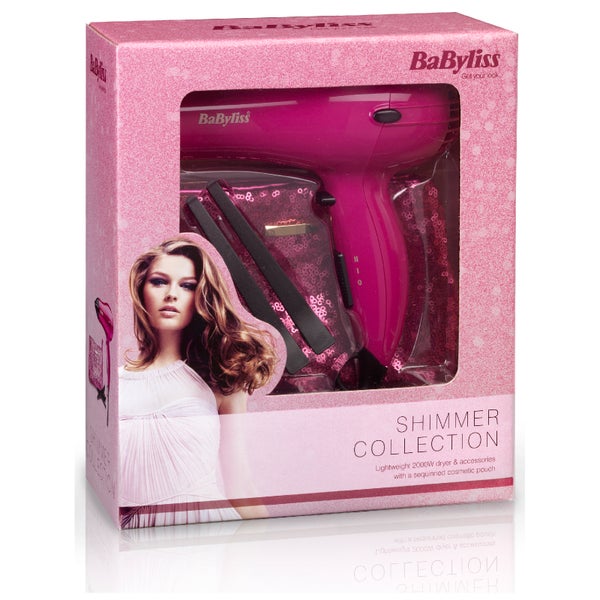Glam up your styling routine with the BaByliss Limited Edition Hair Dryer Gift Set. Stowed away inside a complementary gift box, the limited edition set boasts a compact yet powerful hairdryer, accompanied by a pink sequin cosmetic bag, ideal for storing essential hair accessories, and two sectioning clips for simple styling.