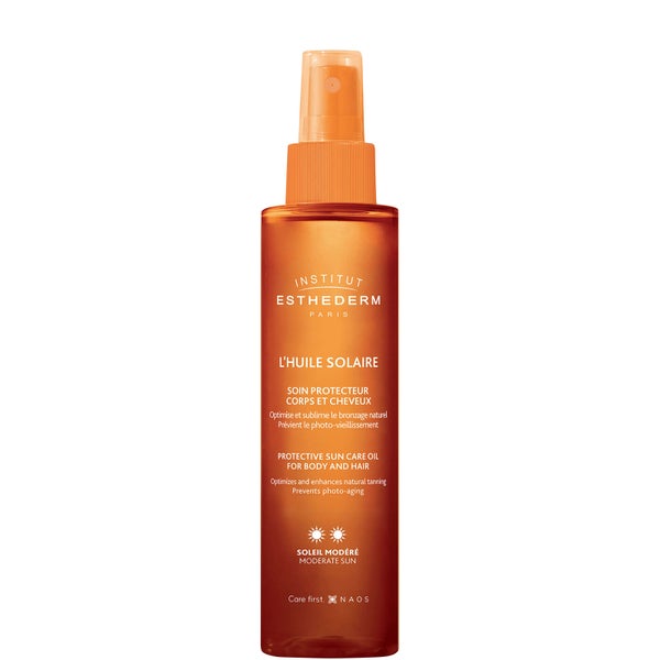 Protect skin from harmful effects of the sun and still develop a golden tan with Institut Esthederm Sun Care Oil for use in Moderate Sun. The rejuvenating sun care oil is a non-greasy formula that is dry to the touch and provides triple cellular protection to combat the damaging and ageing effects of UVA/UVB rays, whilst also stimulating and intensifying the tanning process. The oil is of plant origin and nourishes skin and hair, leaving them incredibly smooth.